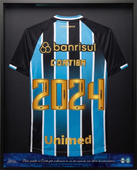 Segundo informações dadas pelo clube, o “Grêmio realizará a entrega de um quadro com camisa personalizada ao Coritiba na Zona Mista da Arena, após a chegada das delegações. A homenagem será feita pelo presidente do Grêmio, Odorico Roman, à diretoria do Coritiba em agradecimento pelo apoio prestado em 2024”. Veja a camisa preparada em prol do Coxa: