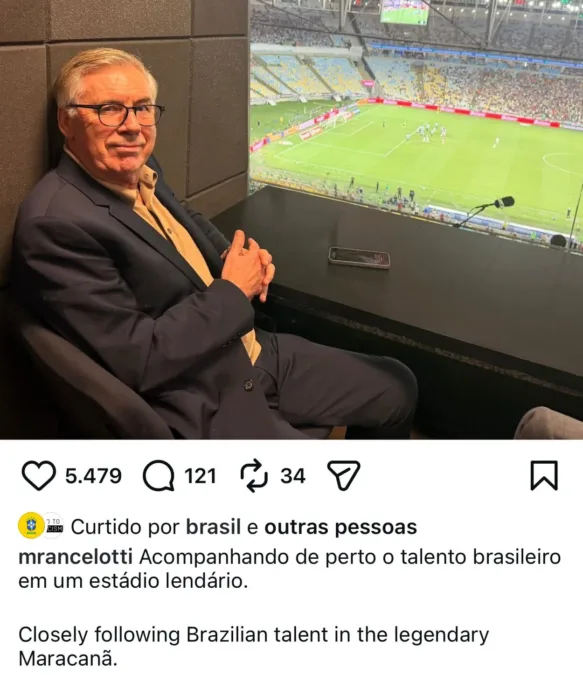 “Acompanhando de perto o talento brasileiro em um estádio lendário”, declarou Ancelotti, que acompanhou o jogo em um dos camarotes do Maracanã ao lado do diretor de seleções da CBF, Rodrigo Caetano, ex-profissional tanto de Grêmio quanto de Fluminense.