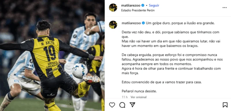“Agradecemos ao nosso povo que nos acompanhou e nos acompanha sempre em todos os momentos. Agora é hora de olhar para frente e continuar trabalhando com mais força. Peñarol nunca desiste”, acrescentou o jogador em post na web.