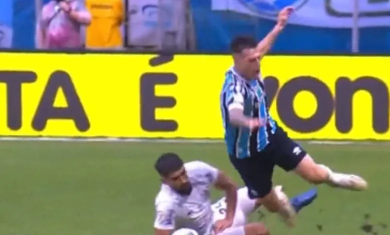 Na continuidade do lance em que o Corinthians reclamou de pênalti em Matheus Bidu, o atacante do Grêmio, Lucas Besozzi, sofreu uma forte entrada do zagueiro Bruno Méndez quase na linha lateral da intermediária. Alertado pelo VAR, o árbitro Rodrigo José Pereira de Lima foi ao monitor e decidiu por dar vermelho ao uruguaio, que é ex-jogador do Inter.
