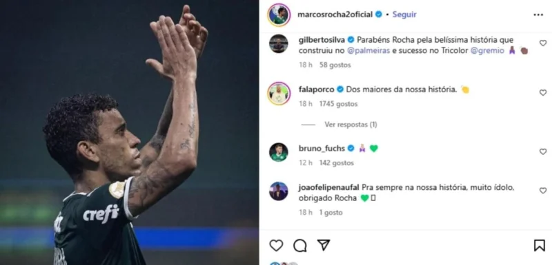 Gilberto foi colega de Rocha no Atlético-MG em 2013 e tinha jogado no próprio Grêmio antes entre 2011 e 2012 ao voltar ao Brasil. “Parabéns, Marcos Rocha, pela belíssima história que construiu no Palmeiras e sucesso no Grêmio”, escreveu o antigo atleta, que defendeu o Arsenal por muitos anos da carreira.