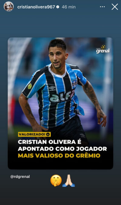 “O atacante do Grêmio, Cristian Olivera, é apontado como o jogador mais caro do plantel tricolor. O valor de mercado do uruguaio está estimado entre 8.3 e 9.6 milhões de euros, segundo o Observatório de Futebol do Centro Inter de Estudos de Esporte (CIES)”, diz o post da emissora compartilhado por Olivera em seus storys.
