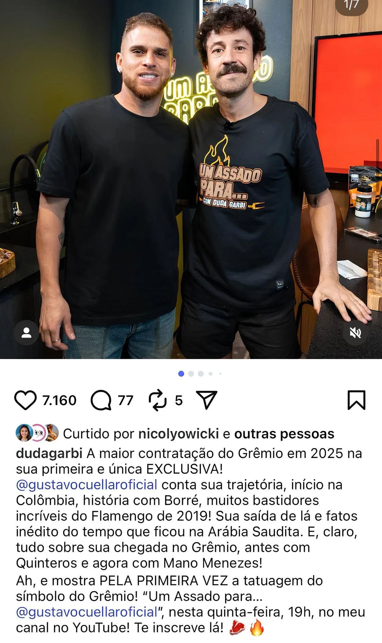 Vivendo uma nova fase com a camisa do Grêmio, tendo sido titular na recente vitória de 3×1 sobre o Atlético Mineiro, fora de casa e de virada, o volante colombiano Gustavo Cuéllar concedeu entrevista ao jornalista Duda Garbi. Ele participou do quadro “Um Assado Para…”, em entrevista que vai ao ar na íntegra na próxima quinta-feira, às 19h, no canal do comunicador no YouTube.