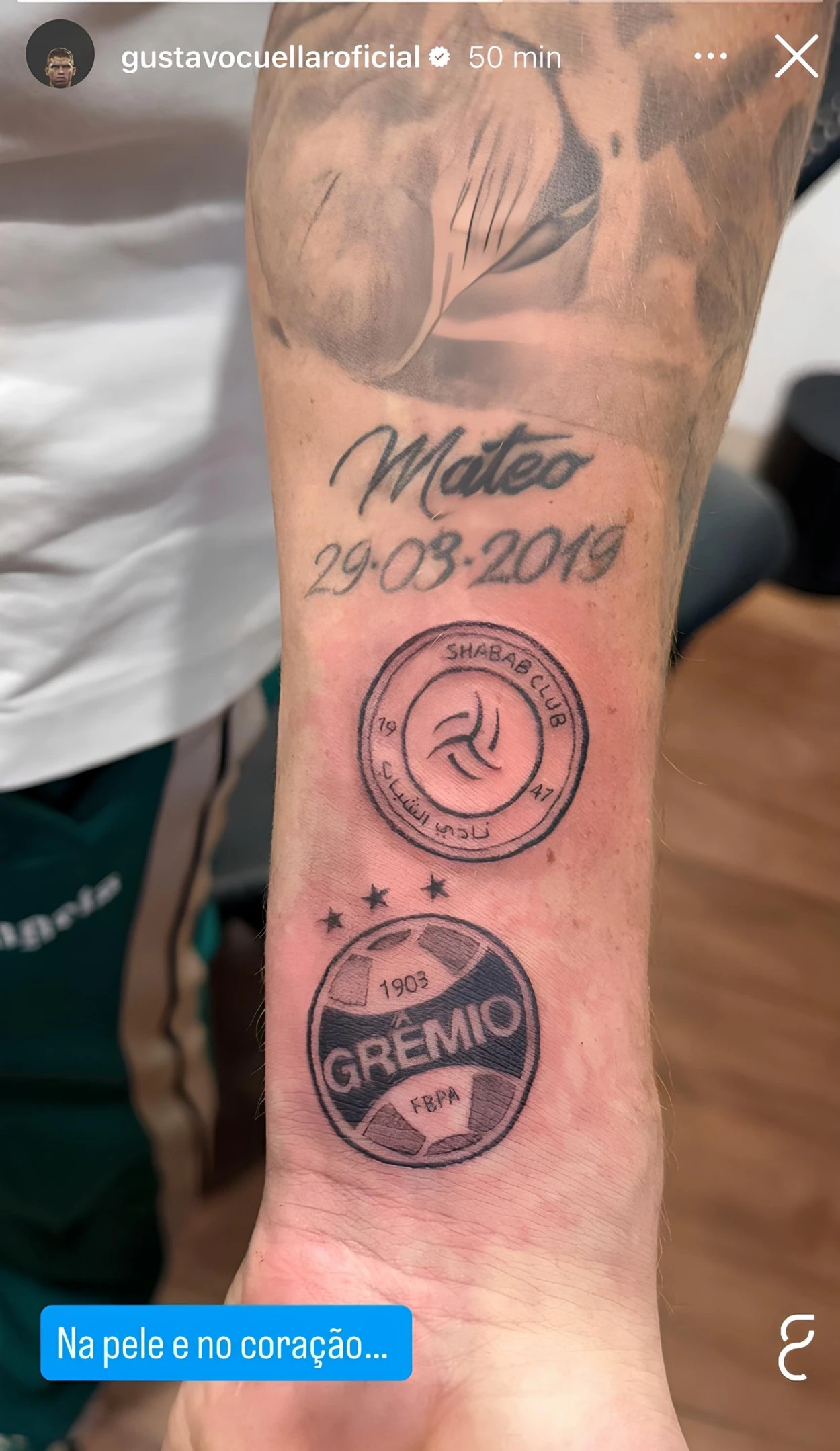“Na pele e no coração”, escreveu Gustavo Cuéllar na legenda da imagem publicada em seu Instagram, exibindo a tatuagem do símbolo gremista.