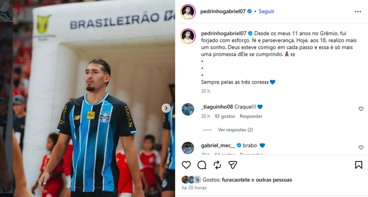 “Desde os meus 11 anos no Grêmio, fui forjado com esforço, fé e perseverança. Hoje, aos 18, realizo mais um sonho, Deus esteve comigo em cada passo e essa é só mais uma promessa dEle se cumprindo. Sempre pelas as três cores”, publicou Pedro no seu Instagram.