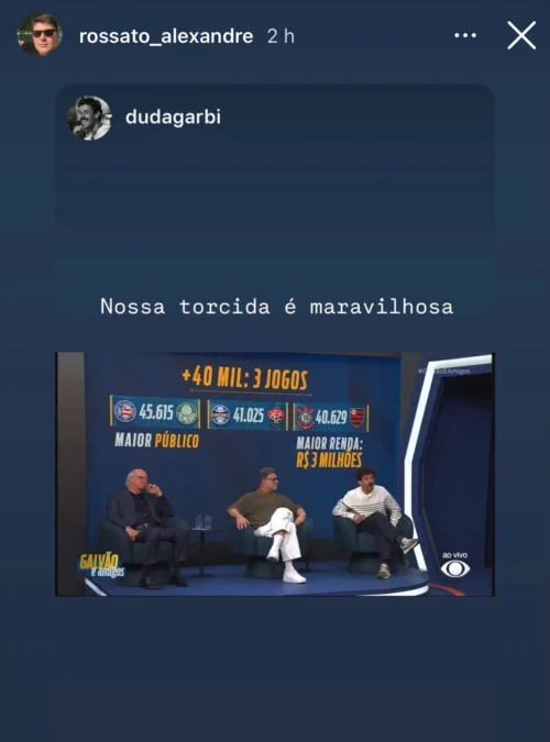 Através do story do seu Instagram, o vice-presidente de futebol atual do Grêmio, Alexandre Rossato, compartilhou um vídeo publicado pelo jornalista Duda Garbi com elogios ao clube e à torcida no programa de Galvão Bueno, o “Galvão e Amigos”, exibido todas as segundas-feiras na TV Bandeirantes. Dessa vez, o próprio experiente locutor chamou a atenção para os torcedores gremistas.