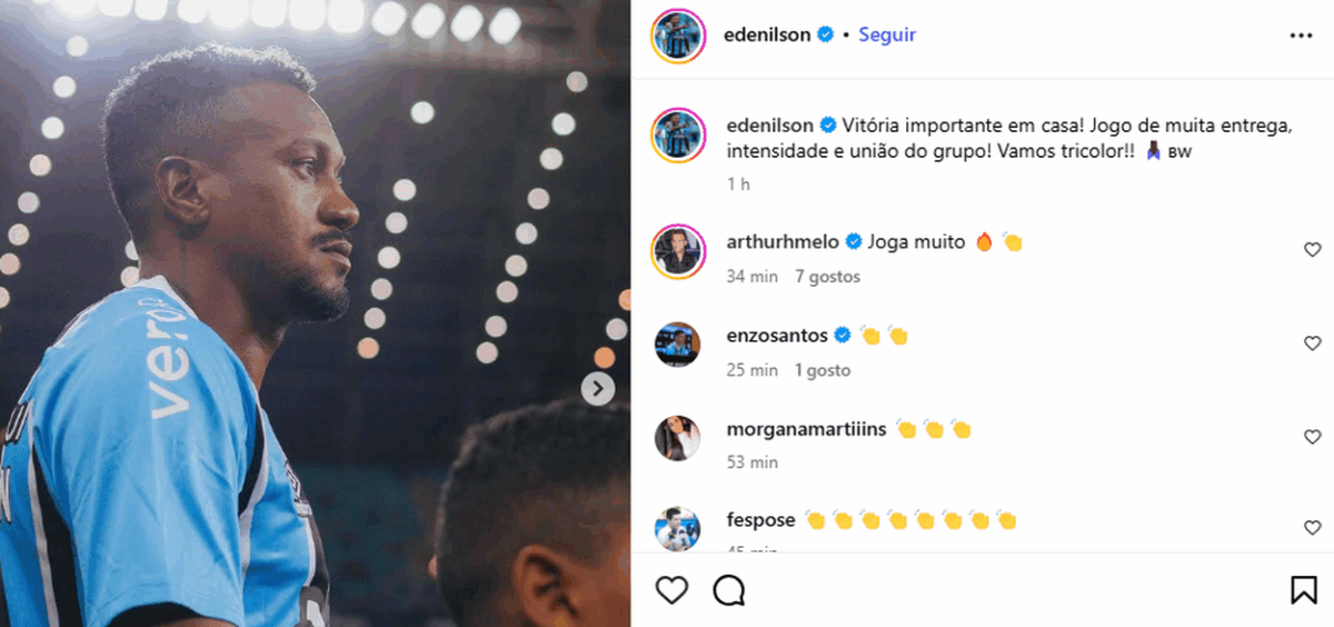 “Vitória importante em casa! Jogo de muita entrega, intensidade e união do grupo! Vamos tricolor!”, escreveu Edenilson, que ainda recebeu um comentário de apoio e de carinho do colega de meio campo Arthur: “Joga muito”.