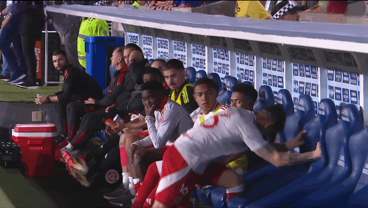 Pouco depois, Ronaldo foi sacado por Roger e chegou ao banco de reservas irritadíssimo, distribuindo socos na poltrona e sendo consolado pelos colegas ao lado.