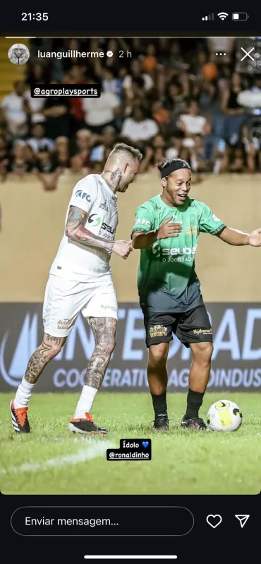Através dos storys, Luan publicou a palavra “ídolo” com um coração azul para Ronaldinho Gaúcho, que tem participado de forma assídua dos jogos festivos de fim de ano. Na foto, R10 aparece com a bola seguido de perto pelo ex-camisa 7 tricolor.