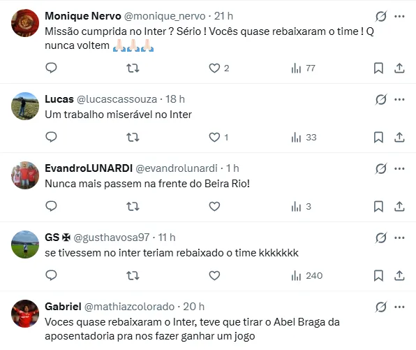 “Que autoestima alta hein Dr. Se o Inter tá na primeira, não tem 1% de trabalho de vocês. Foram horríveis! Quem salvou o Inter foi Abel Braga!“, disparou um torcedor. “Mas que baita mentira. Missão cumprida: enganar mais um bobo e levar uma bela rescisão. Trabalho lixo, precário e por muita sorte foi encerrado antes da tragédia“, afirmou outro colorado.