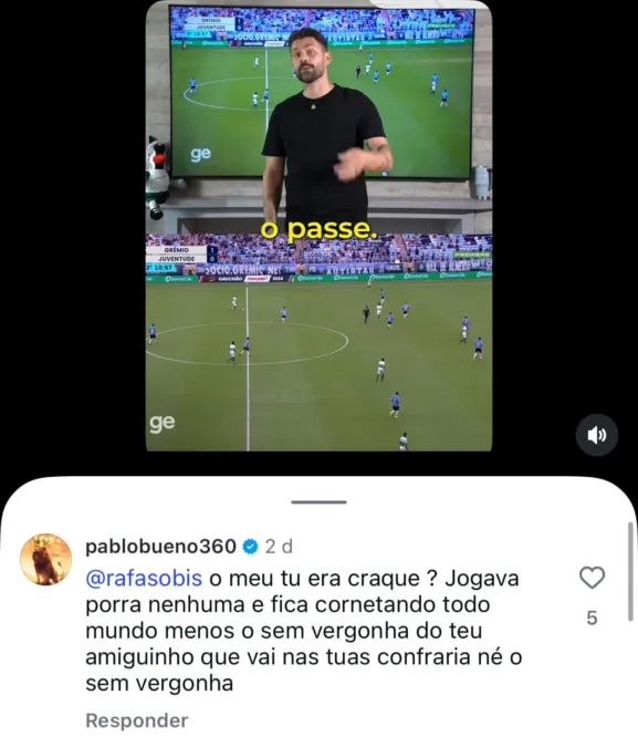 “O meu, tu era craque? Jogava p… nenhuma e fica corneteando todo mundo, menos o sem vergonha do teu amiguinho, que vai nas tuas confrarias. Né, ô sem vergonha”, disparou o empresário nos comentários do Instagram, sem citar o nome de quem seria o “amiguinho” de Sobis.