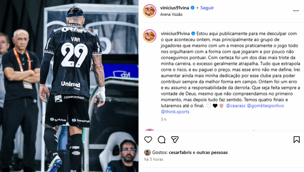 “Estou aqui publicamente para me desculpar com o que aconteceu ontem, mas principalmente ao grupo de jogadores que mesmo com um a menos praticamente o jogo todo nos orgulharam com a forma com que jogaram e por pouco não conseguimos pontuar. Com certeza foi um dos dias mais triste da minha carreira, o excesso geralmente atrapalha”, iniciou Vina, que foi mais além: