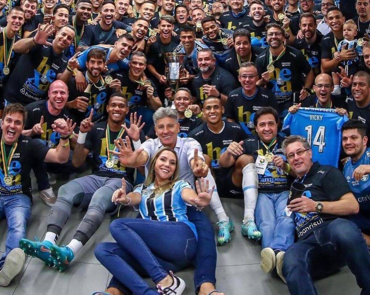 No story do seu Instagram, Carol postou foto ao lado do pai e de Geromel durante a celebração de uma conquista na Arena. “Hoje o Geromel anunciou a aposentadoria e eu confesso que me deu um aperto no coração! Quanta alegria ele deu para nós! Obrigada por tudo”, escreveu.