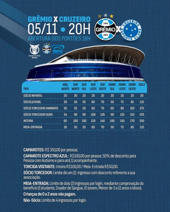 A diretoria do Grêmio, agora tendo oficialmente a posse da Arena, decidiu aumentar o valor dos ingressos de forma sensível para a partida contra o Cruzeiro, quarta-feira, 20h, em mais uma rodada importante da reta final do Brasileirão. Na última semana, em coletiva, os dirigentes já haviam adiantado que os preços teriam uma ampliação em função dos custos de operação do estádio.