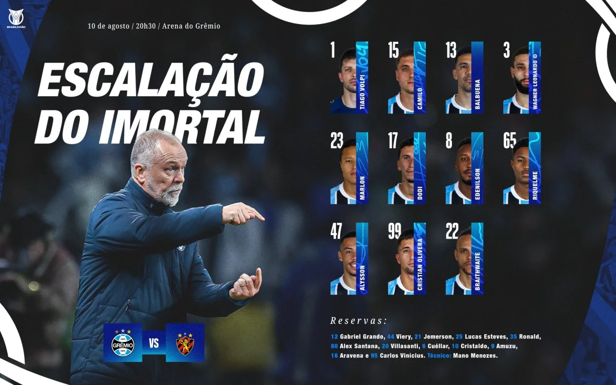 O Grêmio está pronto para o confronto decisivo contra o Sport, neste domingo (10), às 20h30, na Arena, em Porto Alegre, pela 19ª e última rodada do primeiro turno do Campeonato Brasileiro. O técnico Mano Menezes confirmou a escalação, que conta com novidades importantes na defesa e no meio-campo.