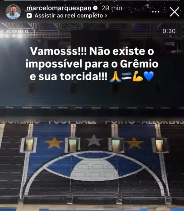 Quem também registrou satisfação pela iniciativa foi o empresário gremista Marcelo Marques, responsável por comprar a Arena e doar ao clube ao longo da temporada de 2025, em gesto muito celebrado pelos torcedores. “Vamosss! Não existe o impossível para o Grêmio e sua torcida!”, postou.