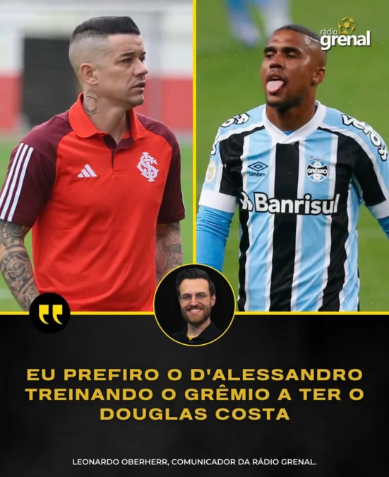 Frustrado com as lembranças da última passagem de Douglas pelo Grêmio, Leonardo disse que prefere ver até um rival no clube antes do que ele: “Eu prefiro o D’Alessandro treinando o Grêmio a ter o Douglas Costa de novo”, disparou.
