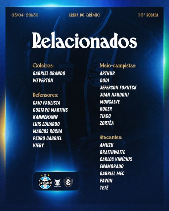 Mantendo o seu planejamento de dar bastante espaço para os jovens jogadores criados na base, o Grêmio relacionou 12 jogadores com passagens pelas divisões de formações do clube para encarar o Remo na noite deste domingo. O duelo está marcado a partir do horário das 20h30, na Arena, em Porto Alegre, com cobertura completa do Zona Mista.