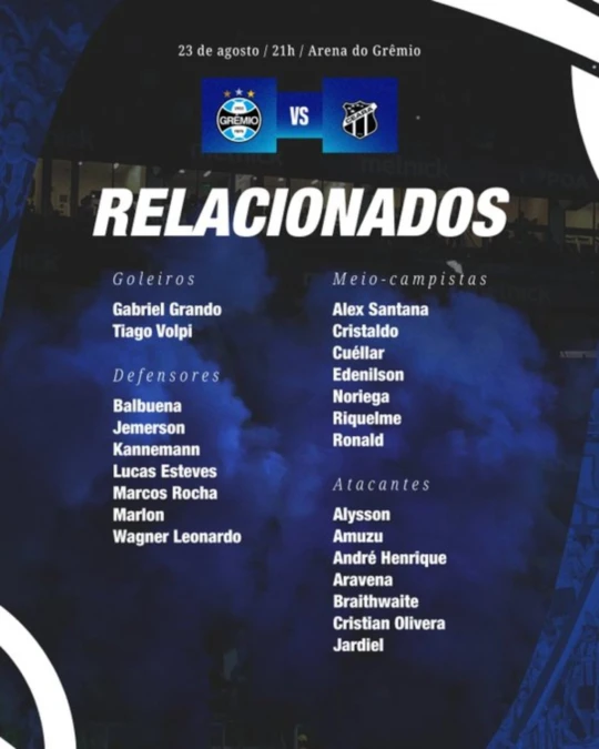 De olho na importante partida diante do Ceará, na Arena, neste sábado, a partir das 21h, pelo Brasileirão, o Grêmio divulgou a sua lista de relacionados com duas novidades principais. Contratados recentemente e regularizados nesta semana, o lateral-direito Marcos Rocha e o volante Erick Noriega estão presentes no grupo de Mano Menezes para logo mais.