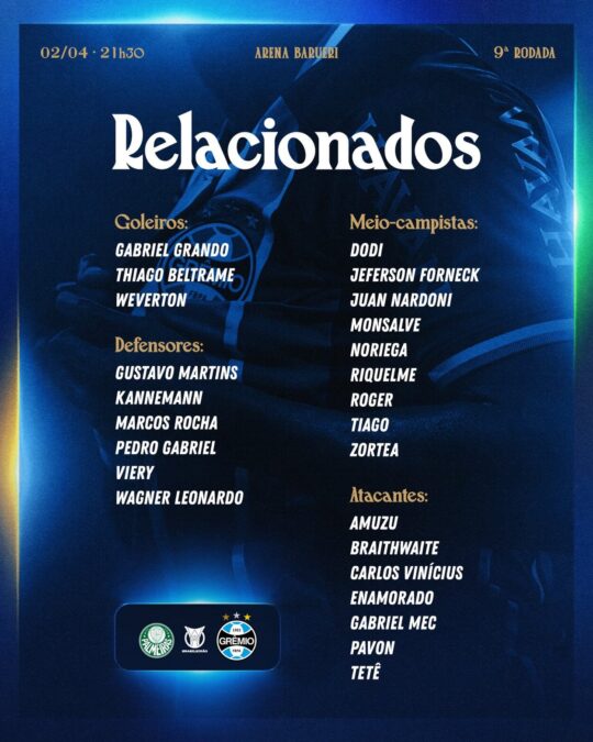 - Goleiros: Weverton, Grando e Beltrame