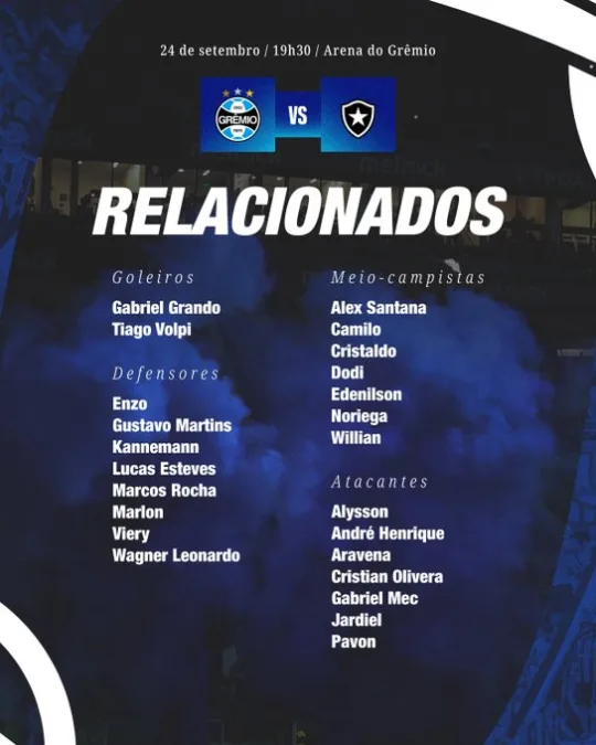 O Grêmio entra em campo nesta quarta-feira, às 19h30, na Arena, para enfrentar o Botafogo em jogo atrasado do Brasileirão. Após a vitória por 3×2 sobre o Inter no Gre-Nal, o clube busca consolidar seu crescimento na competição. Porém, para o duelo, a comissão técnica convive com ausências importantes — e ganha uma novidade interessante na lista de relacionados.