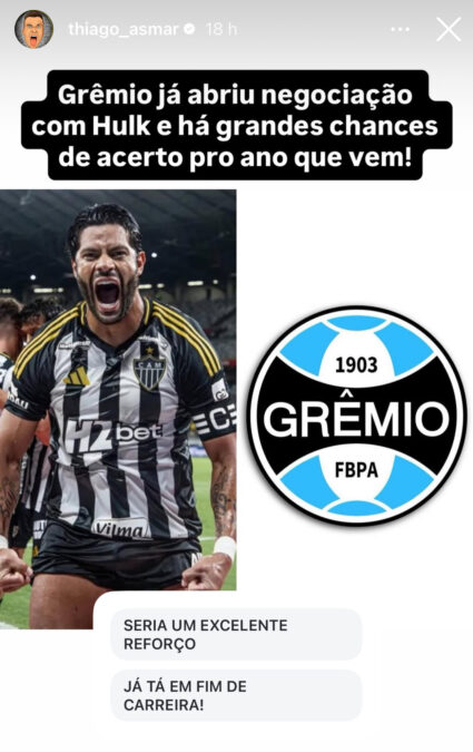 “Grêmio já abriu negociação com Hulk e há grandes chances de acerto pro ano que vem”, publicou Asmar no story do seu Instagram durante o último domingo.