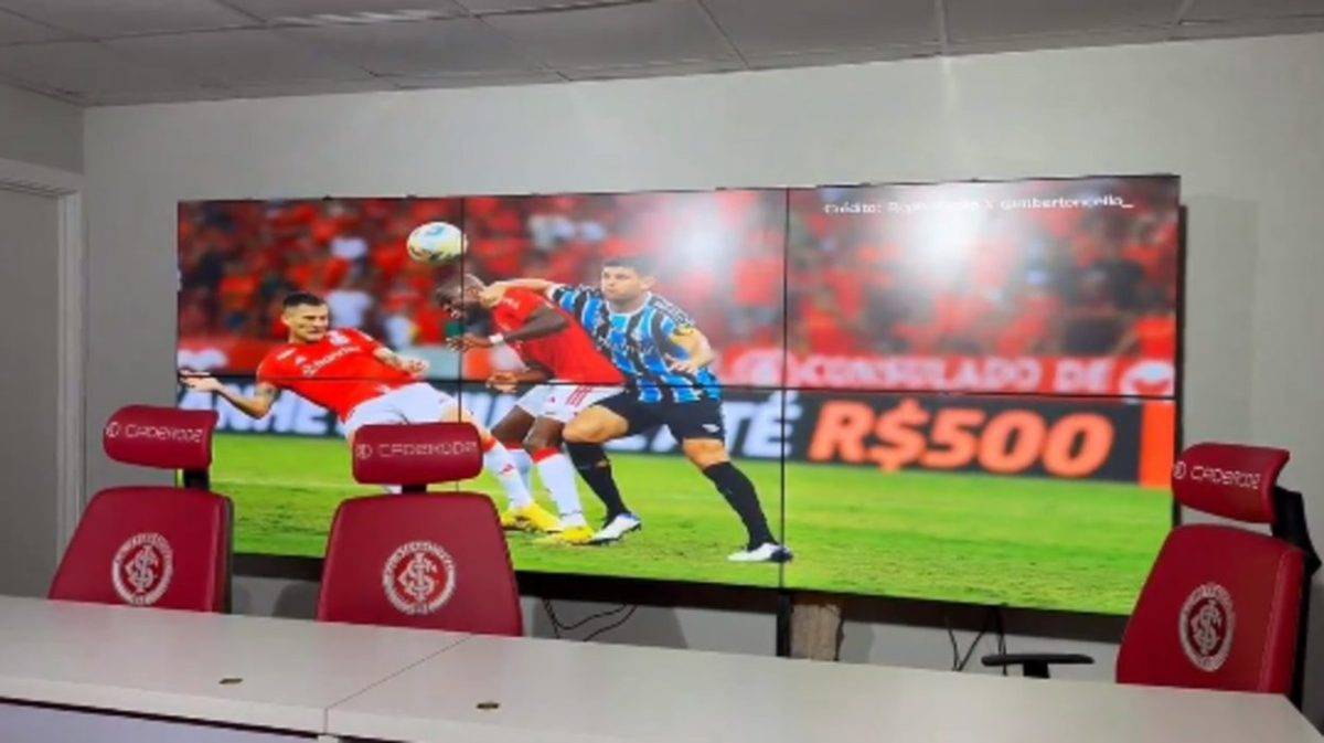 Inter se reapresenta daqui a pouco aqui no CT Parque Gigante. Na sala de imprensa do CT, a tela ligada com diversos lances reclamados pelo Inter no Clássico de ontem… @BandeirantesPOA pic.twitter.com/KtnogFrQRi