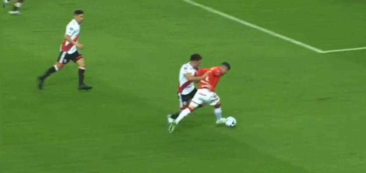 Na jogada, Bustos recebe livre pelo flanco direito e investe em uma jogada individual, mas, ao tocar na frente, cai ao receber contato do atleta adversário. O árbitro Andrés Matonte manda o jogo seguir e o VAR não recomenda a revisão.