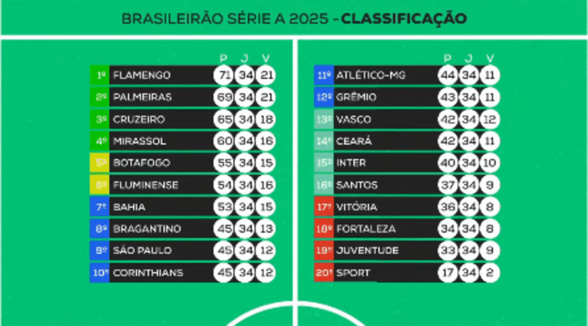 Entre Inter e Vitória ainda há o Santos, no 16° posto, com 37 pontos. Curiosamente, o Colorado recebe o Peixe na próxima segunda-feira, 21h, no Beira-Rio, com tendência de casa cheia. Uma eventual vitória deve deixar o time treinado por Ramón muito perto de assegurar a permanência.