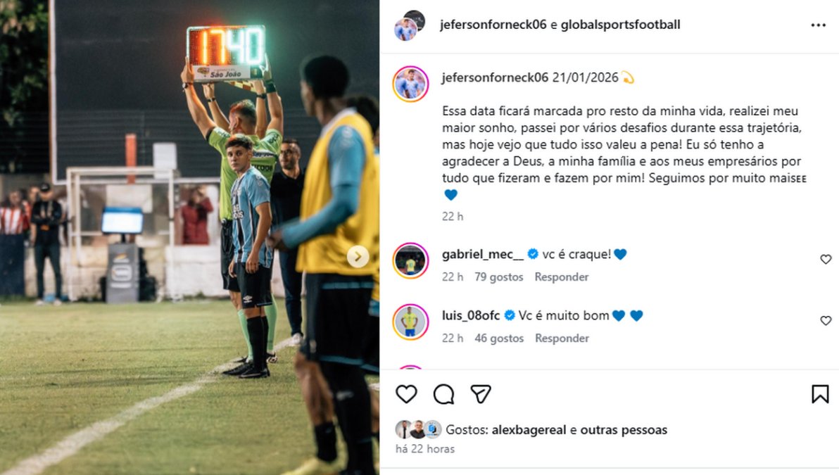 Antiga promessa das categorias de base do Grêmio, o meia Jeferson Forneck, ex-Jefinho, mostrou o seu futebol pela primeira vez no profissional do clube nesta quarta-feira, em Bagé, ao entrar no segundo tempo da vitória de 2×0 para cima do Guarany, pelo Gauchão. Logo em seguida, ele fez um breve texto nas redes sociais explicando o significando desta partida para a sua vida: