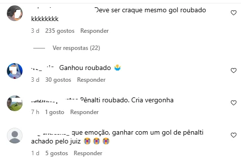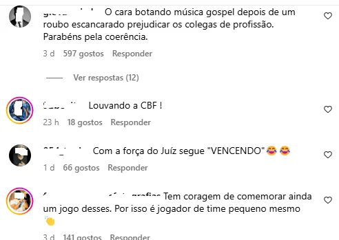 “O cara botando música gospel depois de um roubo escancarado prejudicar os colegas de profissão. Parabéns pela coerência”, escreveu um torcedor. “Tem coragem de comemorar ainda um jogo desses. Por isso é jogador de time pequeno mesmo”, afirmou outro.