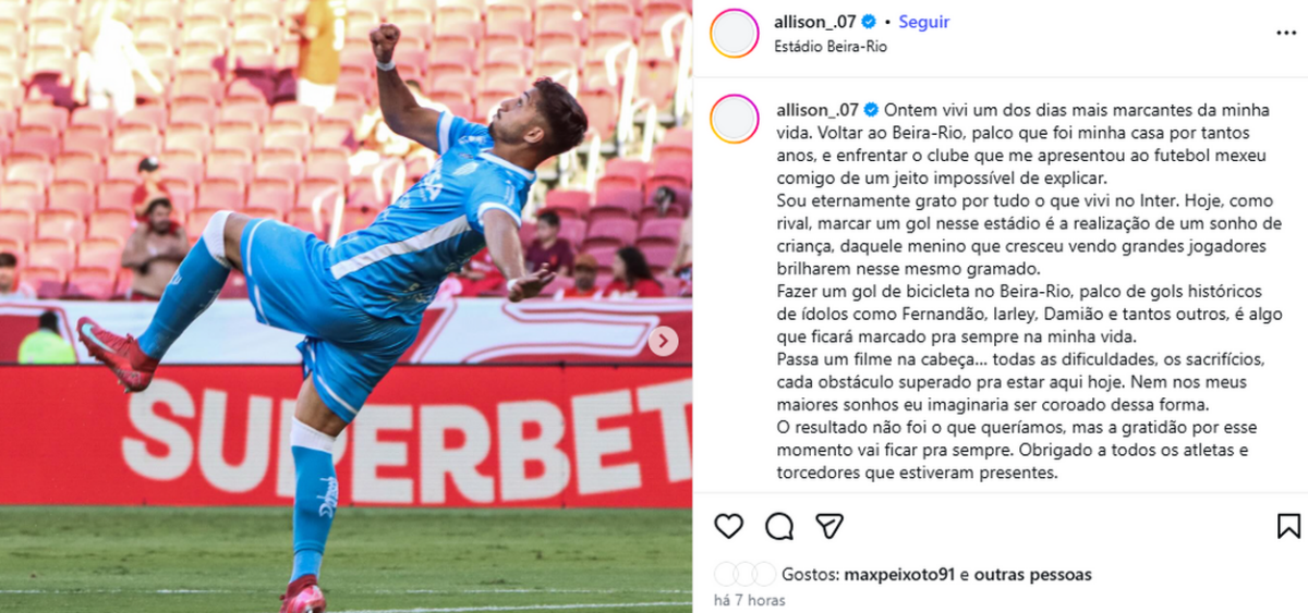 Nas redes sociais, Allison fez questão de realizar um longo post para resumir o seu sentimento depois das emoções vividas no Beira-Rio. Ele citou outros jogadores que marcaram de bicicleta neste estádio em outras eras do Inter, como Leandro Damião, Iarley e Fernandão.