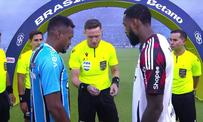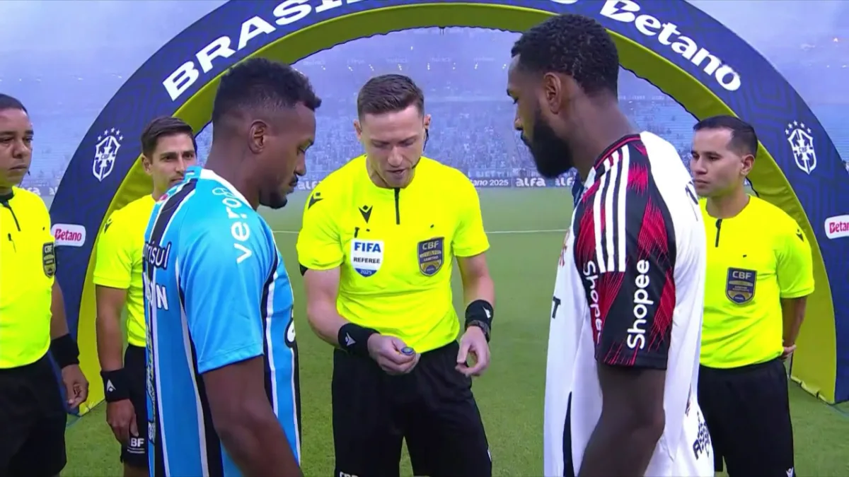 A gravação ainda mostra o pressionado técnico Gustavo Quinteros pedindo para o árbitro ir ao VAR e depois o xingando. O Flamengo venceu o jogo com dois gols de Arrascaeta, um em cada tempo, ampliando a crise no time gaúcho.