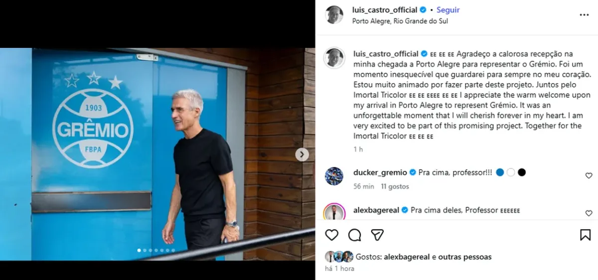 “Agradeço a calorosa recepção na minha chegada a Porto Alegre para representar o Grêmio. Foi um momento inesquecível que guardarei para sempre no meu coração. Estou muito animado por fazer parte deste projeto. Juntos pelo Imortal Tricolor”, afirmou Castro no seu Instagram.