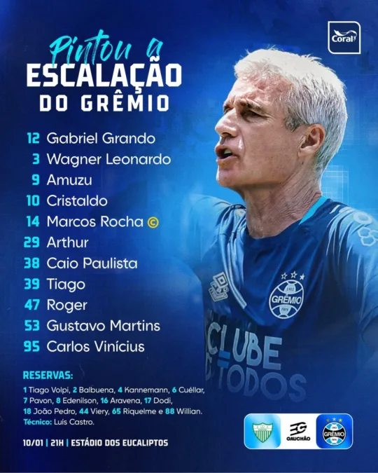 O Grêmio entrou com Gabriel Grando; Marcos Rocha, Gustavo Martins, Wagner Leonardo, Caio Paulista; Arthur, Tiaguinho, Cristaldo; Roger, Carlos Vinícius e Amuzu. RESERVAS – 1 Tiago Volpi, 2 Balbuena, 4 Kannemann, 6 Cuéllar, 7 Pavón, 8 Edenilson, 16 Aravena, 17 Dodi, 18 João Pedro, 44 Viery, 65 Riquelme e 88 Willian.