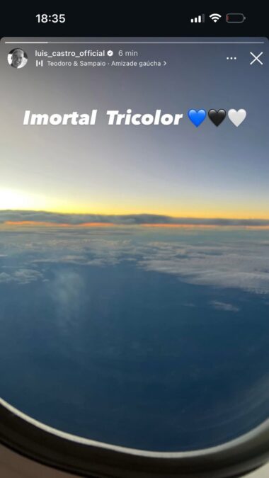 Contratado pela nova diretoria eleita do Grêmio, Luís Castro agitou a torcida gremista com um post feito nas redes sociais a caminho de Porto Alegre. Dentro do avião, ele publicou uma imagem iluminada do céu com música gaúcha de trilha sonora. Além disso, publico a legenda “Imortal Tricolor”, com os corações nas cores do clube.