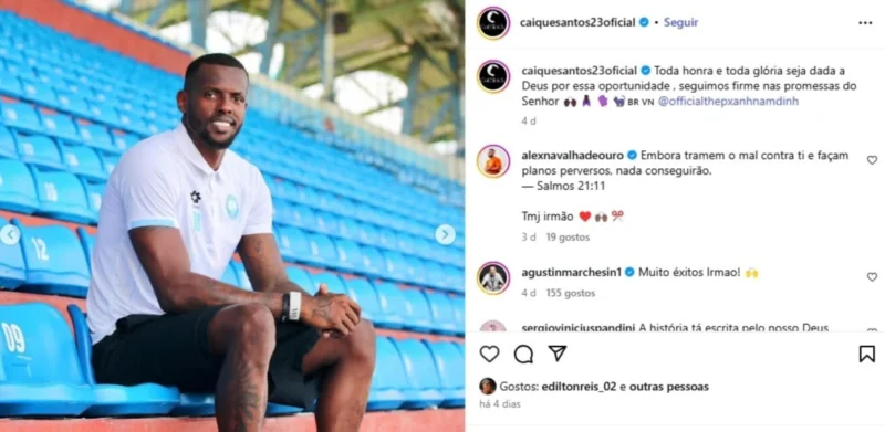 “Toda honra e toda a glória seja dada a Deus por essa oportunidade, seguimos firme na promessas do Senhor”, escreveu Caíque, sempre religioso, em suas redes sociais oficiais após ser anunciado pela equipe do futebol do Vietnã.