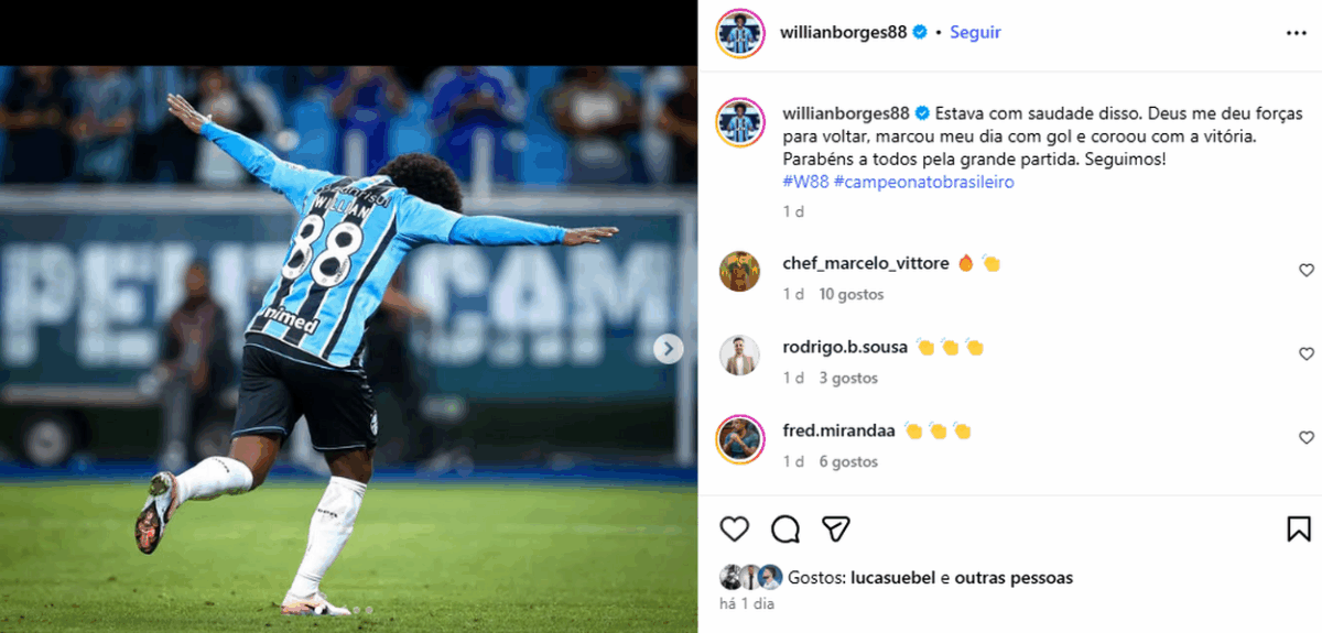 Bastante ativo nas redes sociais, o meia-atacante Willian se manifestou no Instagram logo depois do jogo que marcou o seu retorno ao time do Grêmio após cerca de dois meses afastado por lesão no pé. Ele entrou no segundo tempo da vitória de virada de 3×2 sobre o Palmeiras, na Arena, na terça-feira, inclusive marcando de penalidade máxima o seu primeiro gol com a camisa tricolor.