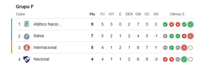 Neste momento, o Atlético Nacional lidera com 9 pontos, seguido pelo Bahia com 7, o Inter com 5 e o Nacional com 4. Todos os times seguem com chances de classificação e as vagas só serão oficialmente decididas na última rodada, no dia 28.