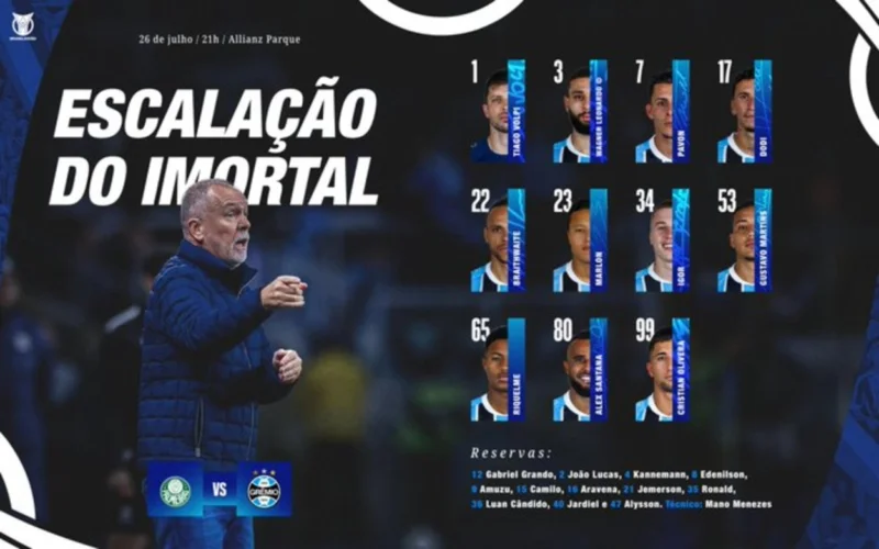 O Grêmio está escalado com Tiago Volpi; Igor Serrote, Gustavo Martins, Wagner Leonardo, Marlon; Dodi, Alex Santana, Riquelme; Pavón, Braithwaite e Olivera. RESERVAS – Gabriel Grando, João Lucas, Kannemann, Edenilson, Amuzu, Camilo, Aravena, Jemerson, Ronald, Luan Cândido, Jardiel e Alysson.