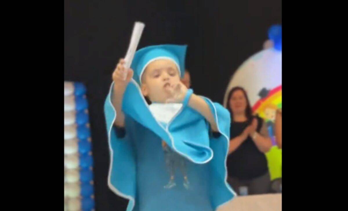 O pequeno gremista, que não teve o seu nome revelado na postagem, escolheu como “música” de formatura a narração de um dos gols de Suárez pelo Grêmio em 2023. E, depois, “beijou a pistola”, imitando a conhecida comemoração do uruguaio.