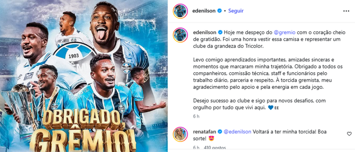“Hoje me despeço do Grêmio com o coração cheio de gratidão. Foi uma honra vestir essa camisa e representar um clube da grandeza do Tricolor. Levo comigo aprendizados importantes, amizades sinceras e momentos que marcaram minha trajetória. Obrigado a todos os companheiros, comissão técnica, staff e funcionários pelo trabalho diário, parceria e respeito. À torcida gremista, meu agradecimento pelo apoio e pela energia em cada jogo. Desejo sucesso ao clube e sigo para novos desafios, com orgulho por tudo que vivi aqui”, postou Edenilson.