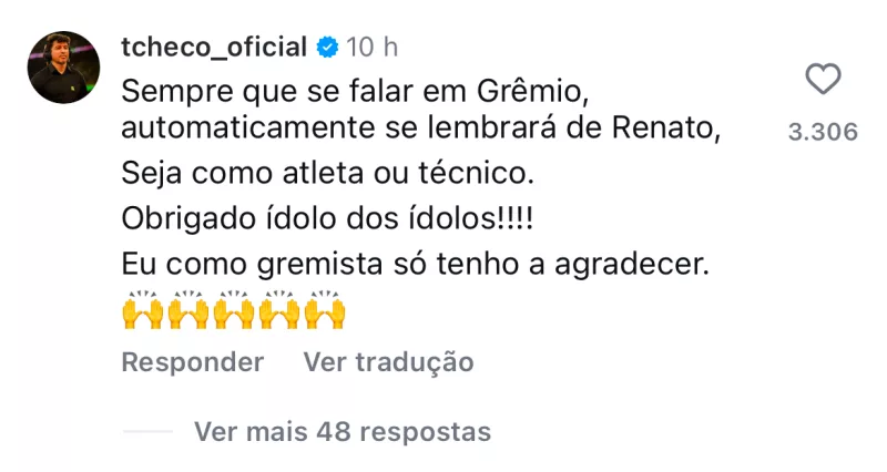 “Sempre que se falar do Grêmio, automaticamente se lembrará do Renato. Seja como atleta ou técnico. Obrigado, ídolo dos ídolos! Eu, como gremista, só tenho a agradecer”, escreveu Tcheco, que já há alguns anos vem exercendo a atividade de treinador.