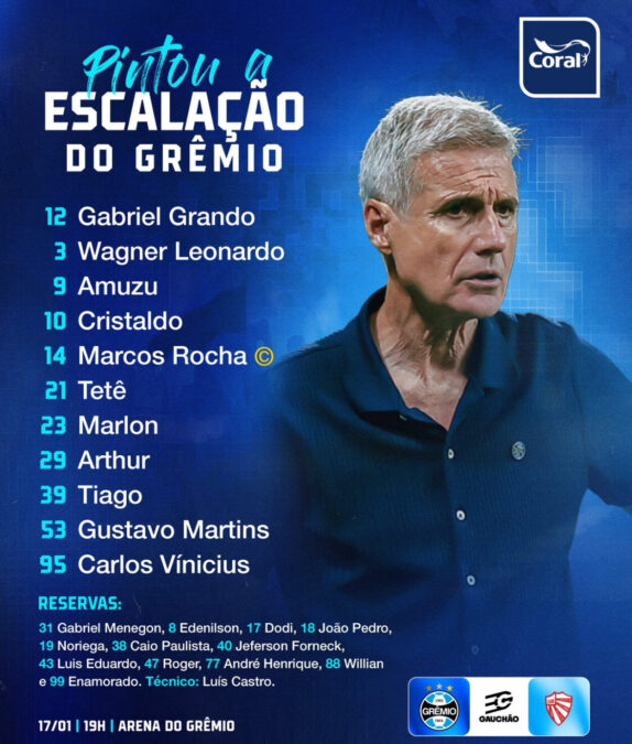 Precisando vencer depois de perder em casa para o São José, o Grêmio vai jogar logo mais com os seguintes atletas: Gabriel Grando; Marcos Rocha, Gustavo Martins, Wagner Leonardo, Marlon; Arthur, Tiaguinho, Cristaldo; Tetê, Carlos Vinícius e Amuzu. RESERVAS – 31 Gabriel Menegon, 8 Edenilson, 17 Dodi, 18 João Pedro, 19 Noriega, 38 Caio Paulista, 40 Jeferson Forneck, 43 Luis Eduardo, 47 Roger, 77 André Henrique, 88 Willian e 99 Enamorado.