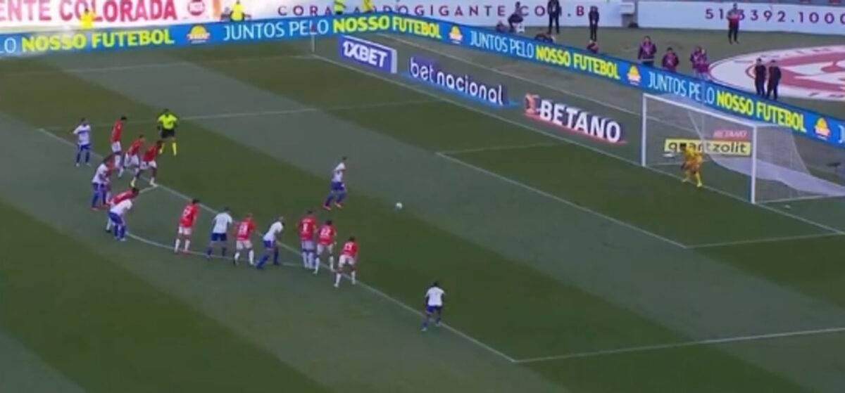 O lance surgiu a partir de um pênalti de Carlos De Pena, que vem atuando improvisado como lateral-esquerdo, em cima de Marinho, igualmente ex-Inter. O árbitro assinalou na hora e Galhardo pegou a bola para botar os cearenses na frente.