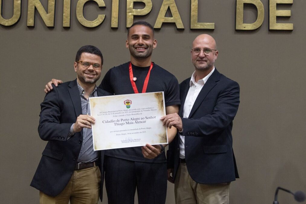 O volante do Inter, Thiago Maia, é o novo Cidadão de Porto Alegre. O título foi concedido pela Câmara de Vereadores da capital do Rio Grande do Sul em evento realizado nesta sexta-feira, que serviu como homenagem pela dedicação, apoio e ajuda dada pelo jogador nos momentos dramáticos da enchente ocorrida em maio do ano passado.