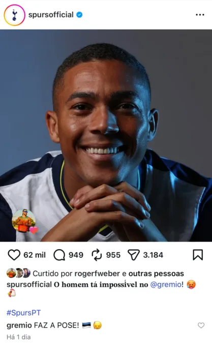 Utilizando uma foto de Carlos Vinícius na sua época na Inglaterra, o Tottenham valorizou a fase inspirada do jogador no Brasil com a seguinte legenda: “O homem está impossível no Grêmio!”. Logo em seguida, o perfil oficial gremista comentou no post: “Faz a pose”, em alusão à comemoração que o atleta costuma fazer.