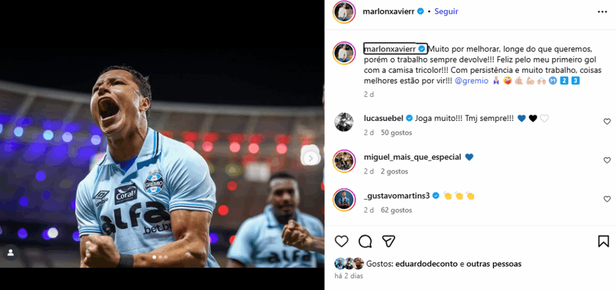 Titular absoluto do Grêmio e já garantido no clube para a temporada de 2026, uma vez que será comprado junto ao Cruzeiro, o lateral-esquerdo Marlon fez questão de dedicar um post na web específico sobre o seu primeiro gol com a camisa tricolor. Ele marcou no recente empate em 2×2 diante do Fortaleza, fora de casa, pelo Brasileirão, saindo satisfeito pelo feito individual, mas frustrado com o desfecho coletivo.