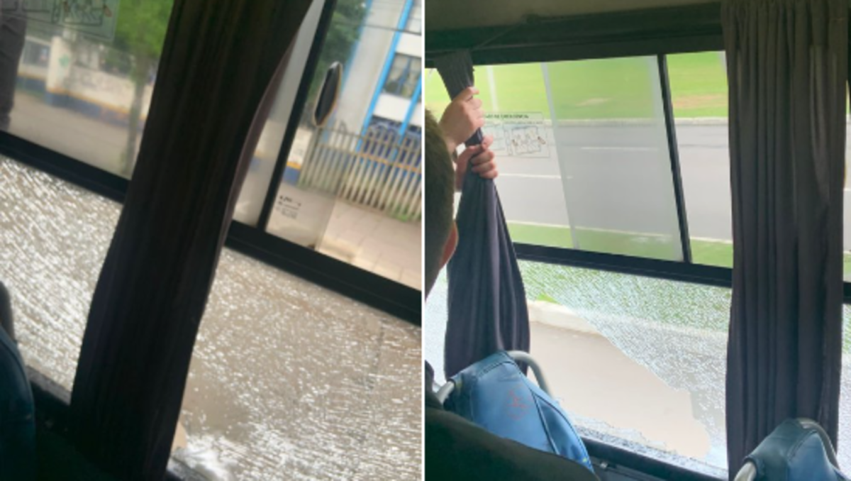 O torcedor do Grêmio que “esteve” no vestiário e motivou o Fluminense contra o Interimagens do interior de um dos ônibus que foi atingido por pedras, no deslocamento para o Beira-rio, pelo menos 2 ônibus tiveram janelas quebradas por pedras