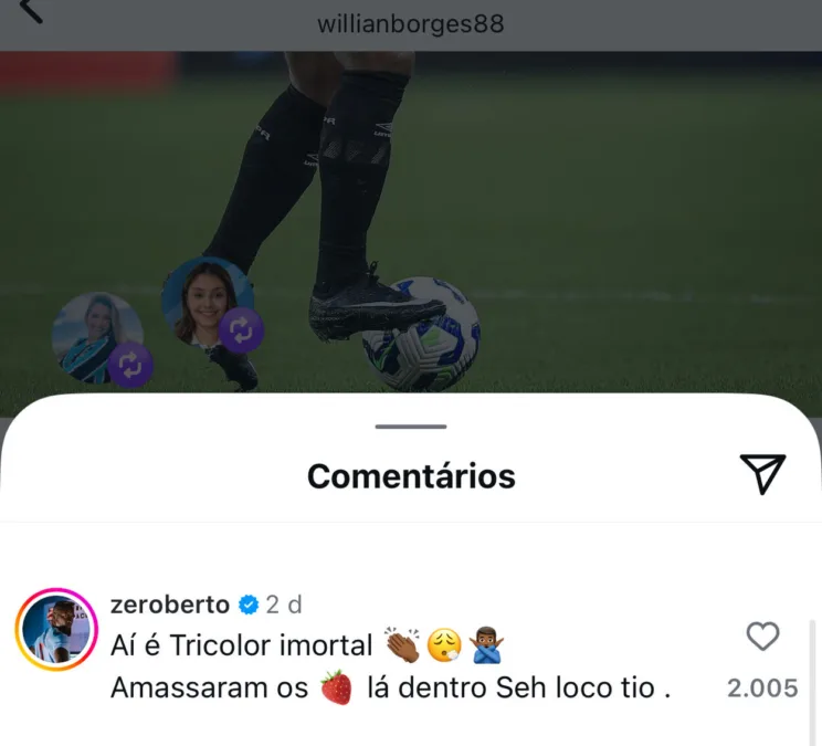 “Hoje foi um dia especial, feliz pela estreia e pela grande vitória! Um clássico que vai muito além do futebol e que representa a paixão de milhões. Orgulho enorme em vestir a camisa do Grêmio. Que seja a primeira vitória de muitas”, publicou Willian, no post comentado por Zé Roberto.